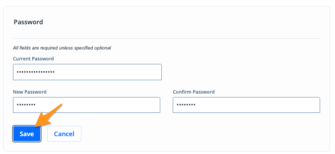 4. Enter the Current Password, New Password and re-enter the new password in the "Confirm Password" field. Click Save.