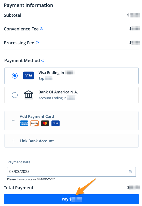 5. Select a payment method and click the blue Pay $--.-- button to complete your payment